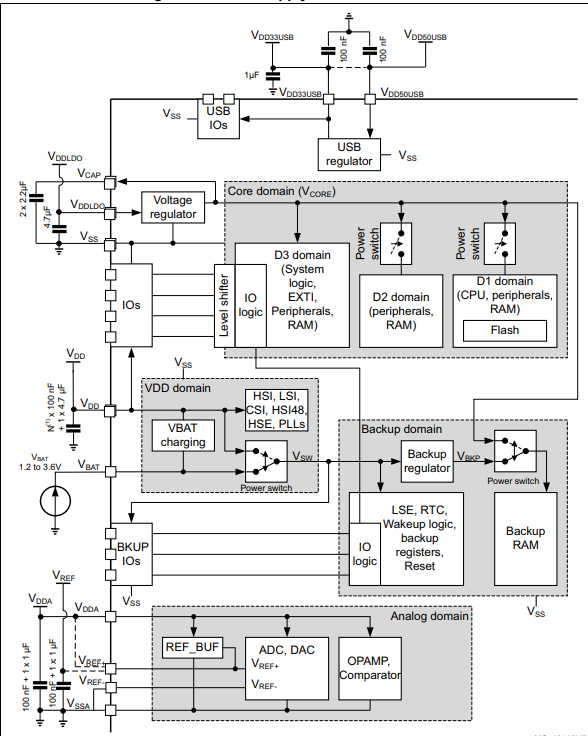 STM32H750xB器件工作在-40°C至+85°C的溫度范圍內(nèi),電源為1.62 V至3.6 V。通過使用外部電源管理器并將PDR_ON引腳連接到VSS,供電電壓可以降至1.62 V。否則,電源電壓必須保持在1.71 V以上,嵌入式電源電壓檢測器啟用。除了LQFP100以外,所有包上都有USB專用電源輸入,以允許更大的電源選擇。一套全面的節(jié)能模式允許低功耗應(yīng)用程序的設(shè)計。
