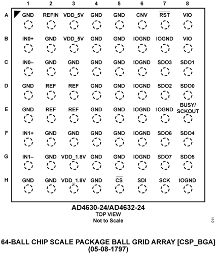 AD4630-24/AD4632-24采用64引腳芯片級球柵陣列(CSP_BGA)封裝,集成了所有關鍵電源和基準電壓旁路電容,縮小了尺寸,減少了系統元件數,同時降低了對電路板布局的敏感性。