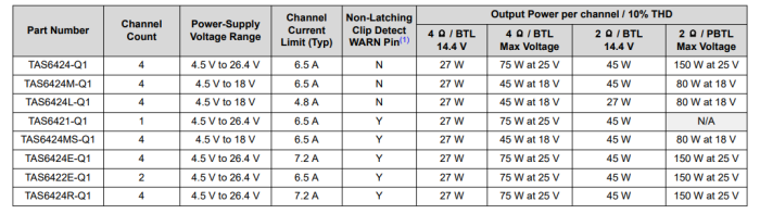TI德州儀器生產(chǎn)的TAS6424R-Q1 器件是一款采用 2.1MHz PWM 開關(guān)頻率的四通道數(shù)字輸入 D 類音頻放大器,以非常小的 PCB 尺寸實(shí)現(xiàn)成本優(yōu)化型器件,可針對(duì)啟停事件在低至 4.5V 的電壓下全面運(yùn)行,并可在高達(dá) 40kHz 的音頻帶寬下提供出色的音質(zhì)。