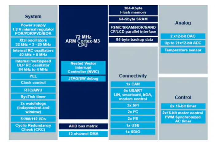 最大頻率72 MHz,0等待狀態(tài)內(nèi)存訪問時(shí)的1.25 DMIPS/MHz(Dhrystone 2.1)性能