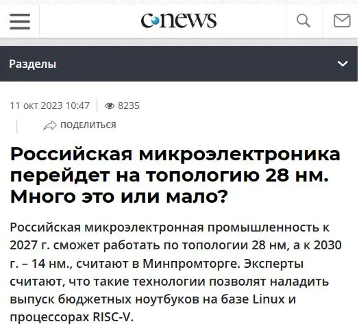 10 月 12 日消息,據俄媒《生意人報》當地時間周三報道,俄羅斯工業和貿易部提出了微電子發展路線圖。報道稱,當前該國的微電子企業可生產 130nm 制程產品,最新的目標是 2026 年量產 65nm 芯片節點工藝、2027 年在本土制造 28nm 芯片、2030 年則量產 14nm。