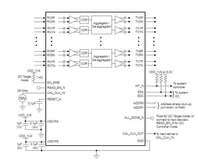 DS560DF810 可通過 I 2C 或外部 EEPROM 進(jìn)行配置。單個(gè) EEPROM 最多可由 16 個(gè)器件共享。