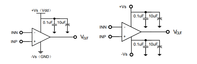 ME321 可以在電源電壓+2.1V~+5.5V,或在雙電源系統(tǒng)電壓±1.05V ~±2.75V 的范圍內(nèi)工作。對于 單電源系統(tǒng),電源需要使用旁路電容到地,通常用一個 0.1uF 的陶瓷電容,它必須放置在靠近+V S 引腳 的位置。對于雙電源系統(tǒng),+V S 和 -V S 都需要用旁路電路耦合到地,通常用一個 0.1uF 的陶瓷電容。 在需要更好應用效果的電路中可以使用 2.2uF 的鉭電容進行替換。如圖所示: