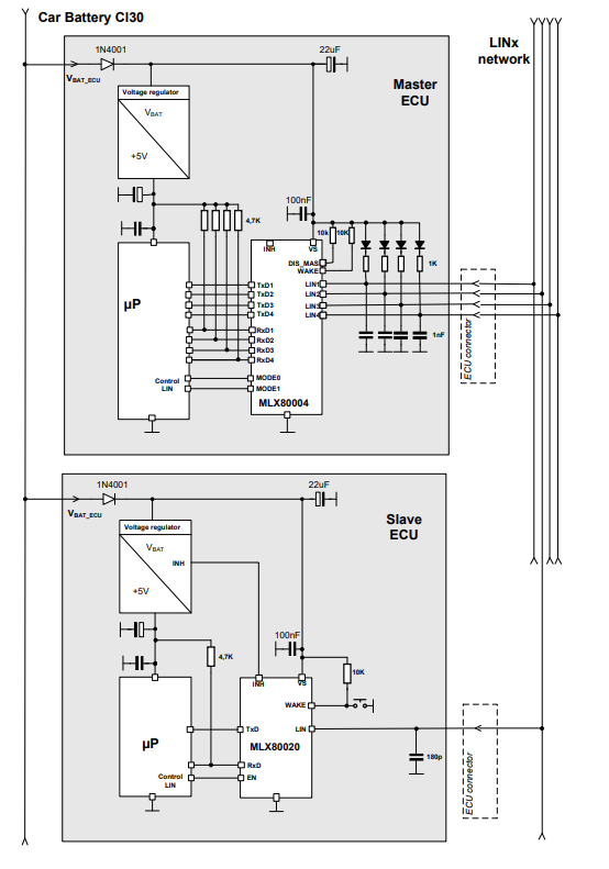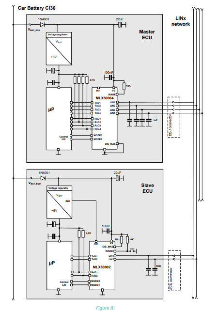 集成LIN 主節(jié)點(diǎn)和從節(jié)點(diǎn)的端(電阻和去耦二極管)