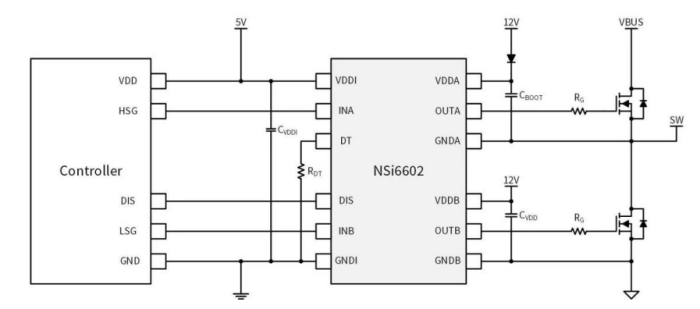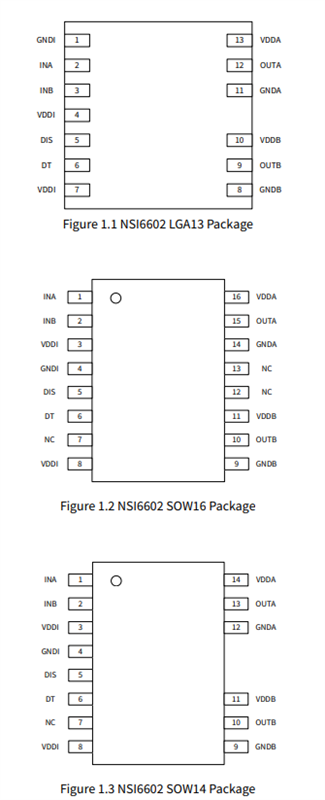 NSI6602是一系列高可靠性的隔離式雙通道柵極驅(qū)動器IC, 可以設(shè)計為驅(qū)動高達2MHz開關(guān)頻率的功率晶體管。每個輸出可以以快速的25ns傳播延遲和5ns的最大延遲匹配來提供最大4A/6A的拉灌電流能力。NSI6602在5*5mmLGA13封裝中按照UL1577提供2500Vrms隔離, 在SOP16封裝中提供3000Vrms隔離, 在SOW16和SOW14封裝中提供5700Vrms隔離。100kV/us的最小共模瞬變抗擾度(CMTI)提高系統(tǒng)魯棒性。該驅(qū)動器的最大電源電壓為28V,而輸入側(cè)則接受3V至5.5V的電源電壓。所有電源電壓引腳均支持欠壓鎖定(UVLO)保護。