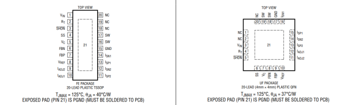 LT3477 采用耐熱增強型 20 引腳 (4mm x 4mm) QFN 和 20 引腳 TSSOP 封裝,從而為恒定電壓和恒定電流應用提供了一個完整的解決方案。