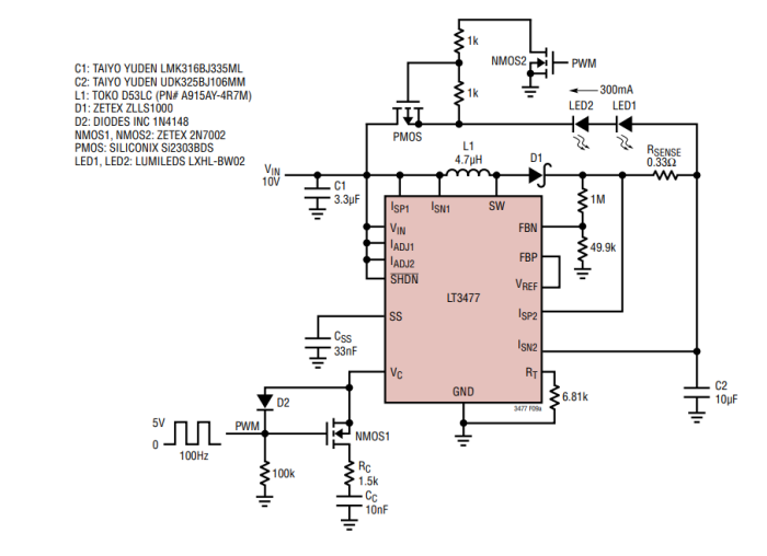 10V至2個白色LED:帶PWM調光的降壓-升壓模式