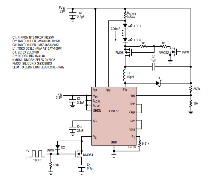32V至6個白色LED:帶PWM調光的降壓模式