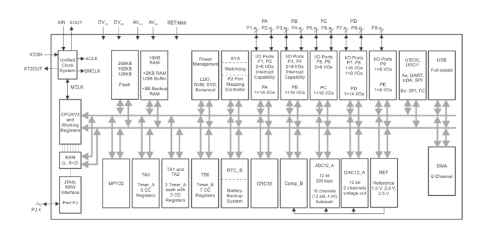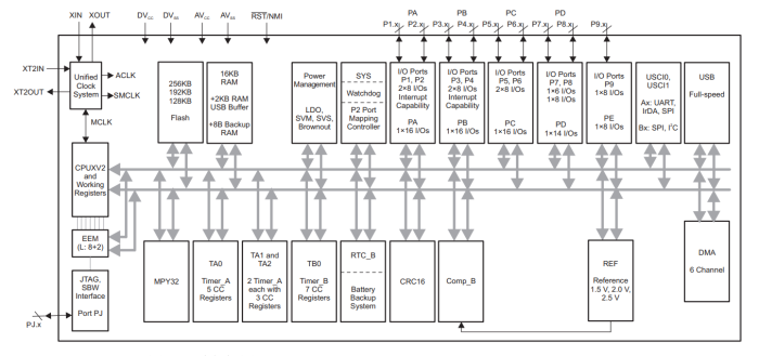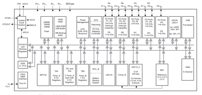 MSP430F563x 器件為配有以下外設(shè)的微控制器:一個高性能 12 位 ADC、一個比較器、兩個 USCI、USB 2.0、一個硬件乘法器、DMA、四個 16 位定時器、一個具有報警功能的 RTC 模塊以及多達(dá) 74 個 I/O 引腳。