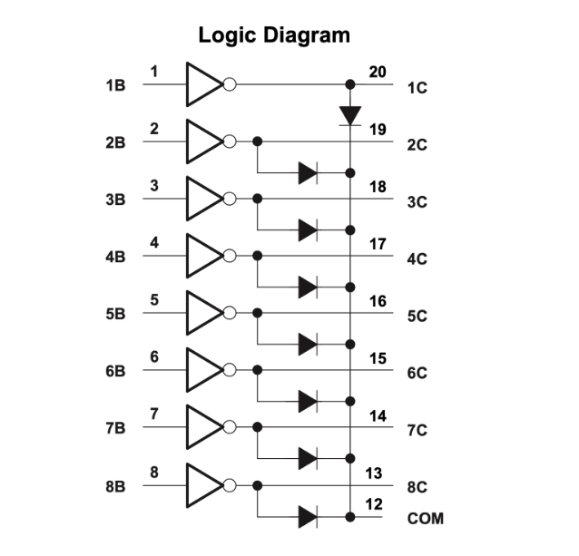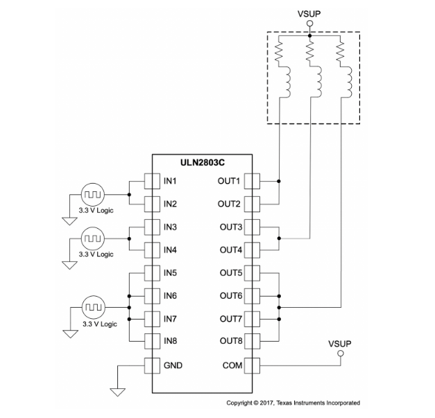 ULN2803C 器件是一款 50V、500mA 達林頓晶體管陣列。該器件由八個 NPN 達林頓對組成,這些達林頓對具有高壓輸出,帶有用于開關(guān)電感負載的共陰極鉗位二極管。每個達林頓對的集電極電流額定值為 500mA。將達林頓對并聯(lián)可以提供更高的電流。