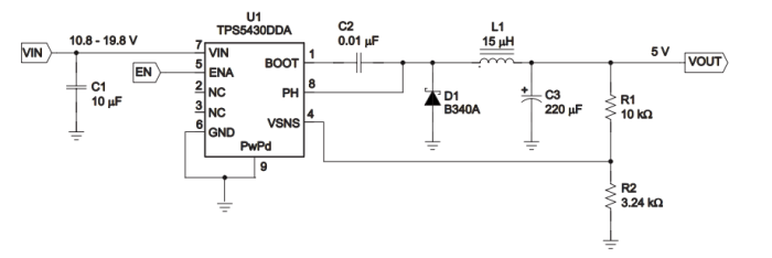 下圖顯示了典型 TPS5430 應用的原理圖。TPS5430 可以在 5V 的標稱輸出電壓下提供高達 3A 的輸出電流。為 了獲得適當的熱性能,器件下方裸露的 PowerPAD? 必須焊接至印刷電路板。