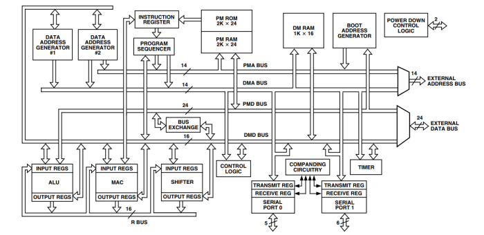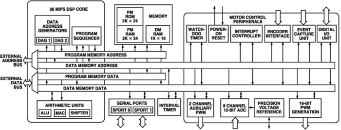此外,ADMC401BST器件通過(guò)利用DSP內(nèi)核的完整地址和數(shù)據(jù)總線,還增加了重要的外部存儲(chǔ)器和外設(shè)擴(kuò)展能力。此功能允許擴(kuò)展外部程序和數(shù)據(jù)存儲(chǔ)器,且意味著DSP內(nèi)核可以尋址高達(dá)14K × 24位的外部程序存儲(chǔ)器和高達(dá)13K × 16位的外部數(shù)據(jù)存儲(chǔ)器。