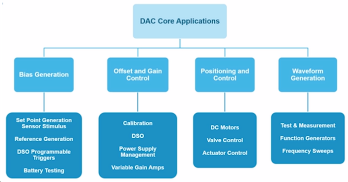 DAC在信號(hào)鏈中可以執(zhí)行很多功能,例如偏置的生成、失調(diào)和增益控制、定位和控制,以及像波形的產(chǎn)生等。下圖顯示了一些主要的高端最終應(yīng)用,在這些應(yīng)用中經(jīng)常可以找到特定功能的DAC。