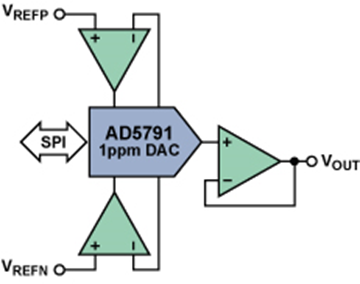 半導(dǎo)體處理技術(shù)、DAC架構(gòu)設(shè)計(jì)和快速片內(nèi)校準(zhǔn)技術(shù)的發(fā)展使穩(wěn)定、建立時(shí)間短的高線性度數(shù)模轉(zhuǎn)換器成為可能。這種轉(zhuǎn)換器可提供高優(yōu)于1 ppm的相對(duì)精度、0.05 ppm/°C溫度漂移、0.1 ppm p-p噪聲、優(yōu)于1 ppm的長(zhǎng)期穩(wěn)定性和1MHz吞吐量。這類(lèi)小型單芯片器件保證性能規(guī)格,無(wú)需校準(zhǔn)且簡(jiǎn)單易用。AD5791及其配套基準(zhǔn)電壓源和輸出緩沖的典型功能框圖如下圖所示。