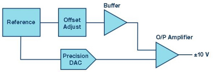 雙極性輸出DAC的主要元件如以上功能框圖所示。它由精密DAC、基準(zhǔn)電壓源、基準(zhǔn)電壓緩沖器、失調(diào)和增益調(diào)整以及輸出放大器組成。集成精密基準(zhǔn)電壓源以適應(yīng)16位應(yīng)用非常困難,但最近的工藝進(jìn)步和設(shè)計(jì)技術(shù)允許在片內(nèi)設(shè)計(jì)和集成具有出色漂移和熱特性的基準(zhǔn)電壓源。熱關(guān)斷、短路保護(hù)等故障保護(hù)模式,以及上電/關(guān)斷等狀況下的輸出控制,是雙極性DAC通常會(huì)集成的重要特性,可以簡(jiǎn)化系統(tǒng)設(shè)計(jì)。DAC提供數(shù)字碼以相對(duì)于基準(zhǔn)電壓轉(zhuǎn)換輸出電壓。調(diào)整模塊提供偏移和調(diào)整DAC傳遞函數(shù)的功能。