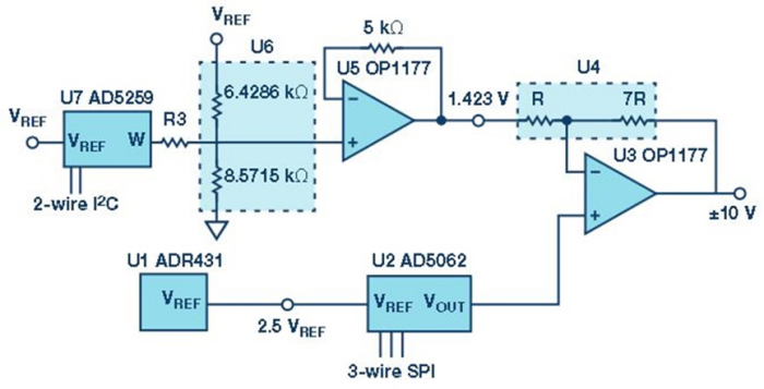精密DAC適合于要求1LSB(最低有效位)或更小誤差的高精度、高達(dá)20位分辨率的應(yīng)用;Nano DAC是ADI受歡迎的低壓?jiǎn)坞娫串a(chǎn)品系列,功耗低,解決方案尺寸最小,適合于需要高密度且存在空間限制的應(yīng)用;digiPOT系列產(chǎn)品可以用于簡(jiǎn)化開(kāi)環(huán)應(yīng)用或匹配容差,提供易失性和非易失性存儲(chǔ)解決方案,支持最多1024位調(diào)整應(yīng)用;直接數(shù)字頻率合成和阻抗轉(zhuǎn)換器可提供快速采集和高精度調(diào)諧分辨率,DDS的目標(biāo)應(yīng)用是需要精密或敏捷的頻率和相位控制的應(yīng)用。ADI還有乘法DAC輸出和雙極性DAC產(chǎn)品系列,可提供快速建立特性和最高+/-10V的寬輸出范圍。乘法DAC是電流輸出DAC,需要緩沖器才能轉(zhuǎn)換為輸出電壓,此類(lèi)DAC允許將AC或DC輸入信號(hào)用作基準(zhǔn)電壓;工業(yè)DAC提供廣泛的可編程輸出范圍,從適合標(biāo)準(zhǔn)電流環(huán)路通信的4-20mA到適合執(zhí)行器控制的±10 V,還能與ADI HART調(diào)制解調(diào)器相結(jié)合,為過(guò)程控制和工廠自動(dòng)化應(yīng)用提供可靠且精確的解決方案。下面是兩個(gè)應(yīng)用實(shí)例。