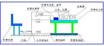 工作臺面或墊:表面電阻值106-109Ω;摩擦電壓<100V;對地系統電阻106-108Ω。