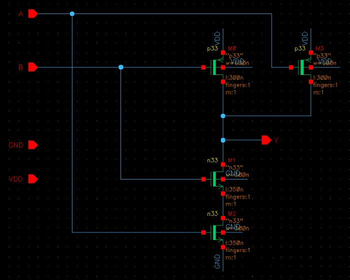 最后把PMOS塊和NMOS塊連接到相同的輸出端口就能實現邏輯運算了。
