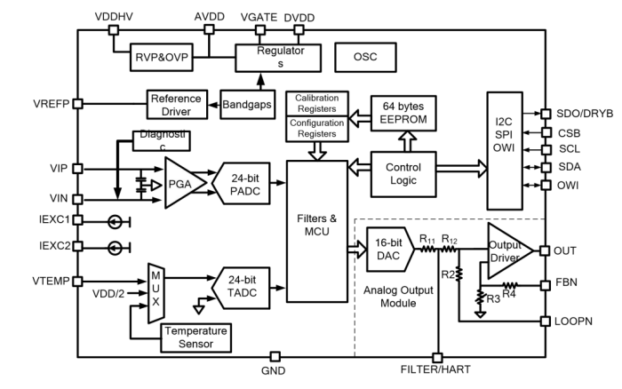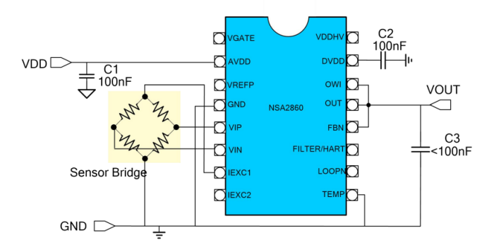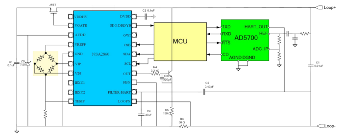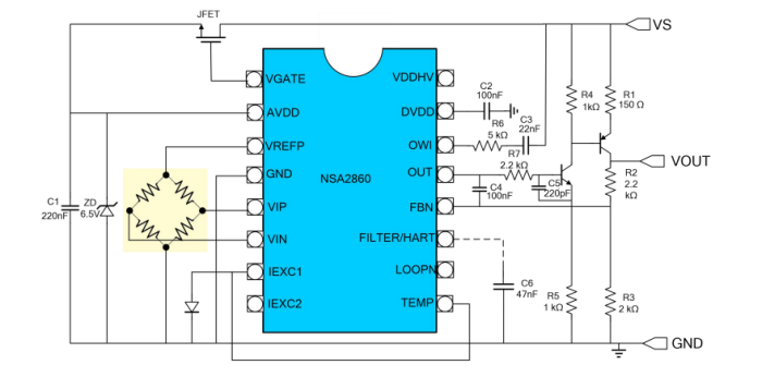 納芯微NSA2860是一顆高集成度的用于阻式或者電壓 型傳感器例如阻式壓力傳感器,熱電偶,RTD 等傳感器信號調(diào)理和變送輸出的專用芯片。 NSA2860集成了外部JFET控制器,24位主信號 測量通道和24位輔助溫度測量通道,傳感器校 準(zhǔn)邏輯,雙路恒流源等電路,并可以支持?jǐn)?shù)字 接口輸出,模擬電壓輸出,4~20mA變送輸出,PWM/PDM輸出等各種輸出模式。高集成 度和巧妙的接口方案,使得NSA2860僅需最少 的外部器件,即可實現(xiàn)壓力或溫度變送模塊的 校準(zhǔn)和變送。通過內(nèi)置的MCU,NSA2860支持 對傳感器的零點,靈敏度的二階溫度漂移校準(zhǔn) 以及最高三階的非線性校準(zhǔn),校準(zhǔn)精度可以達(dá) 到0.1%以內(nèi),其校準(zhǔn)系數(shù)存儲于一組EEPROM 中。