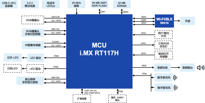 i.MX RT117H是 i.MX RT1170系列跨界MCU的邊沿計算平臺成員,面向嵌入式智能HMI應用。它采用恩智浦先進的Arm? Cortex-M7內核(運行速度高達1 GHz)和高能效Cortex-M4?內核(高達400 MHz),可提供高性能和實時響應。除了交鑰匙的視覺/語音算法和圖形用戶界面功能外,得益于其搶占式多任務處理和雙核架構下的軟件框架,i.MX RT117H還擁有強大的CPU、內存資源和豐富的外設供客戶使用。這些功能為客戶提供了最大的靈活性,可以在不同的用例中定制和定義其產品。i.MX RT117H MCU被授權運行恩智浦的面部/手勢識別庫、音頻前端庫和ML語音引擎庫,其中包括: