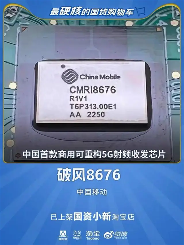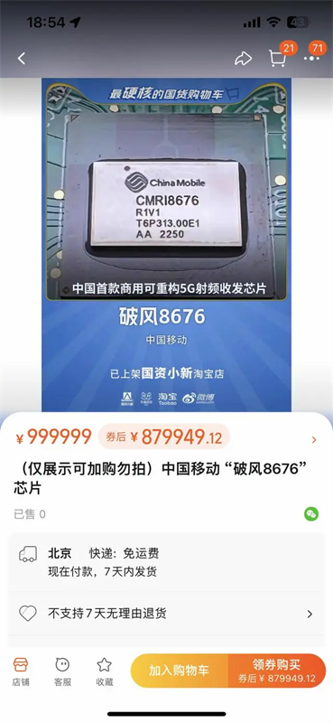 《科創板日報》記者今日注意到,在國資委淘寶店鋪“國資小新”內,上架了一款中國移動“破風8676”芯片,該款芯片是中國首款商用可重構5G射頻收發芯片,淘寶售價為999999元,不過,現在只能展示加購不能購買。