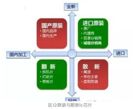 市面上的ic芯片林林總總、各式各樣,不注意區分,有時很難看出各種料有何不同。現在我們看看有哪些區分原裝與散新芯片的要點。