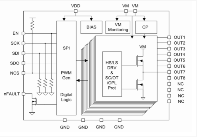 NSD8308-Q1HTSXR是一款多通道半橋驅動芯片,內部集成8通道半橋,通過靈活配置,芯片可以支持多種不同的負載類型包括直流有刷電機,步進電機,繼電器和LED等。該芯片內置PWM生成器,僅通過SPI即可實現配置PWM頻率與占空比以達到控制負載的功能,可應用于直流有刷電機軟啟動與LED調光等;同時該產品提供智能診斷功能,幫助車機系統判斷負載連接狀態,如果出現斷線或者短路情況,外部MCU可以通過芯片內部寄存器獲取獨立通道的報錯信息。