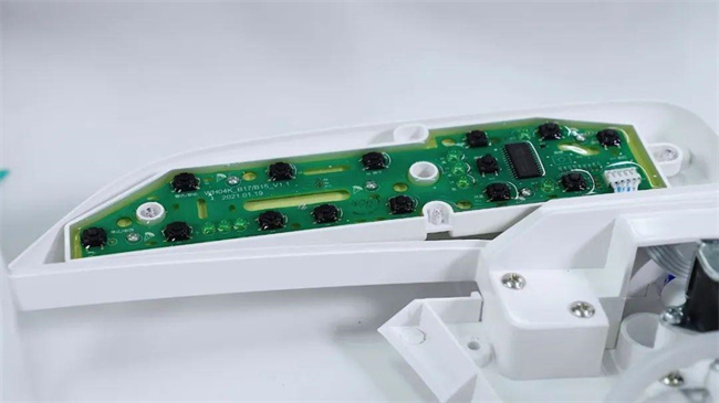 按鍵面板主板使用透明有機硅膠灌封,使用了1顆寬體SOP的MCU進行按鍵檢測、LED控制。按鍵面板主板通過1根排線連接到主控板上進行供電和通訊。