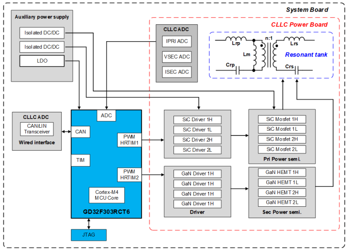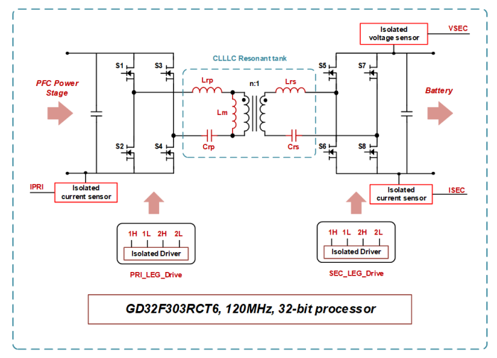 采用GD32F303RCT6微控制器:得益于HRPWM定時(shí)與ADC采樣的高精度,使得CLLC將設(shè)計(jì)頻率提高到500kHz在數(shù)字控制的可實(shí)現(xiàn)性上,變成了可能,從而為整機(jī)系統(tǒng)的高功率密度和高效率綜合優(yōu)化提供了控制保障