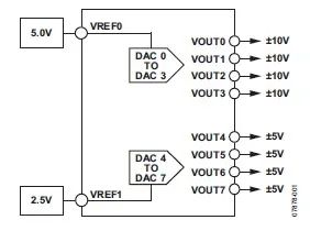 根據 AD5362 的描述,我們了解到器件內部 DAC0-DAC3 使用一個基準源 VREF0,DAC4-DAC7 使用另外一個基準源 VREF1,所以可以利用不同的基準電壓值來實現不同的 DAC 輸出范圍,如下圖 (圖2) 所示: