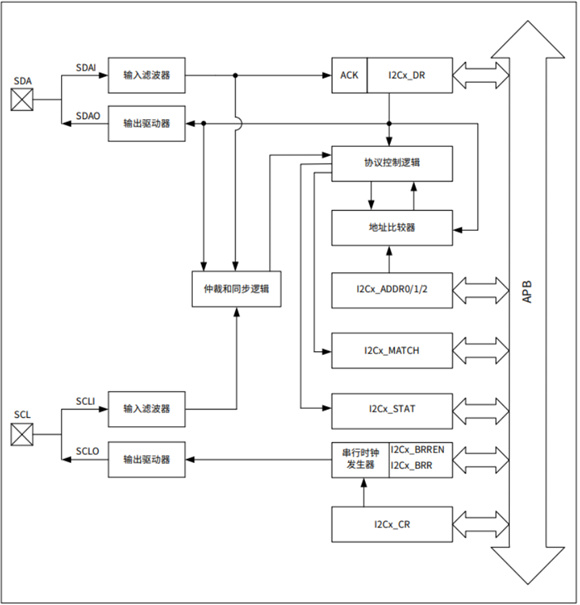 I2C 模塊主要包括時鐘發(fā)生器、輸入濾波器、地址比較器、協(xié)議控制邏輯、仲裁和同步邏輯、以及相關(guān)寄存器等。