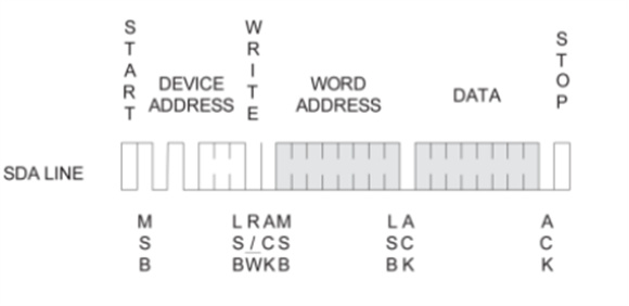 字節(jié)寫操作時序:起始信號+器件地址(7bit)+讀寫指示(1bit)+存儲空間地址(8bit)+寫入數(shù)據(jù)(8bit)+停止信號,即可完成指定字節(jié)寫入操作。