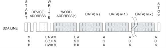 頁寫操作時序:起始信號+器件地址(7bit)+讀寫指示(1bit)+存儲空間地址(8bit)+寫入數(shù)據(jù)(8bit*8)+停止信號,即可完成指定地址(必須是頁起始地址)的頁寫入操作。