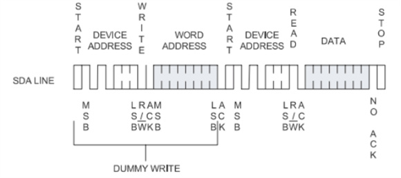 隨機讀操作時序:起始信號+器件地址(7bit)+讀寫指示(1bit)+存儲空間地址(8bit)+重復(fù)起始信號+器件地址(7bit)+讀寫指示(1bit),之后器件會返回1字節(jié)數(shù)據(jù),主機收到后發(fā)送停止信號,即可完成指定字節(jié)讀取操作。