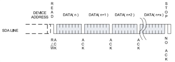 順序讀操作時序:和隨機讀時序類似,只是在主機接收到1字節(jié)數(shù)據(jù)后,不發(fā)送停止信號,而是繼續(xù)發(fā)送時鐘進行下一個字節(jié)數(shù)據(jù)的接收,直到所有所需讀取的數(shù)據(jù)全部讀取,之后再發(fā)送停止信號。