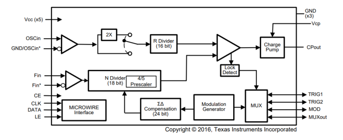 LMX2491RTWR器件是一款具有斜坡/線性調(diào)頻生成功能的低 噪聲 6.4GHz 寬帶 Δ-Σ 分數(shù) N PLL。它由一個相位頻 率檢測器、可編程電荷泵以及適用于外部 VCO 的高頻 輸入組成。LMX2491RTWR廣泛支持各類靈活的斜坡功能, 包括 FSK、PSK 和多達 8 段的可配置分段線性 FM 調(diào) 制配置文件。該器件具有精密 PLL 分辨率和快速斜升 功能,相位檢測器速率高達 200MHz。LMX2491RTWR 允許 讀回其任一寄存器。LMX2491RTWR 可由 3.3V 單電源供電 運行。此外,該器件支持電壓高達 5.25V 的電荷泵, 無需使用外部放大器即可提供相位噪聲性能得到改善的 簡易解決方案。