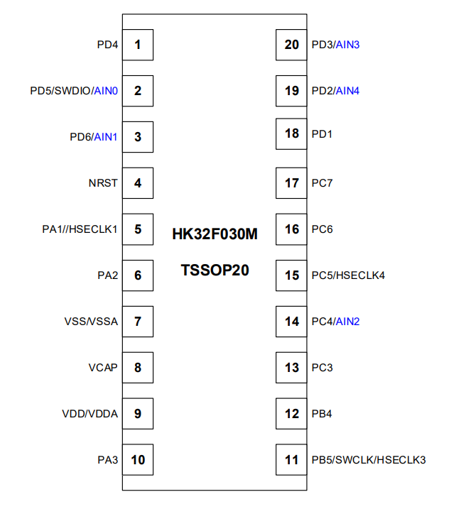 HK32F030MF4P6除電源、地以外的所有引腳都可以作為 GPIO、外設 IO 或外部中斷輸入 (TSSOP20 封裝產(chǎn)品支持 16 個 GPIO);在引腳數(shù)量受限應用場景中最大可能的提供引腳 信號數(shù)量。