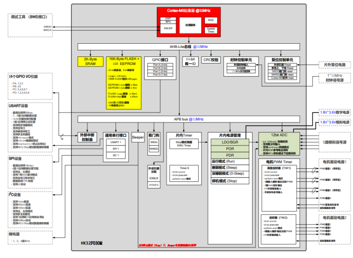 HK32F030MF4P6內置 1 個 16-bit 高級 PWM 定時器(共 4 路 PWM 輸出,其中 3 路帶死區(qū) 互補輸出),1 個 16-bit 通用 PWM 定時器(共 4 路 PWM 輸出);1 個 16-bit 基本定時器(定 時輸出 CPU 中斷)。 HK32F030M 內置了模擬電路:1 個 12-bit 1Msps ADC(有效精度 8Bit)、1 個 POR/PDR 上/下電復位電路和 1 個內部參考電壓(內部參考電壓在片內被 ADC 采樣)。 HK32F030M 支持豐富的功耗模式,在低功耗模式下,HK32F030M 可被內部的低功耗 定時器自動喚醒。 HK32F030MF4P6工作于-40°C 至+85°C 的溫度范圍,供電電壓 1.8V 至 3.6V,可滿足絕大 部分應用環(huán)境條件的要求。