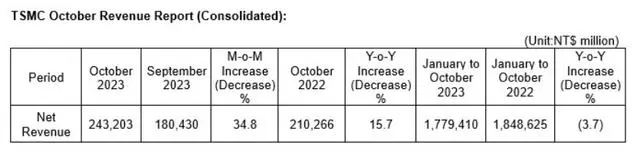 11月10日,臺積電(TSM.US)公布2023年10月營收報告。數據顯示,臺積電10月合并營收為新臺幣2432.03億元,環比增長34.8%、同比增長15.7%。這是臺積電自今年2月以來月度營收的首次同比正增長,突顯出全球芯片市場似乎正逐漸從低谷中復蘇。受此消息提振,臺積電美股上周五收漲6.35%,創下5月份以來的最大單日漲幅。