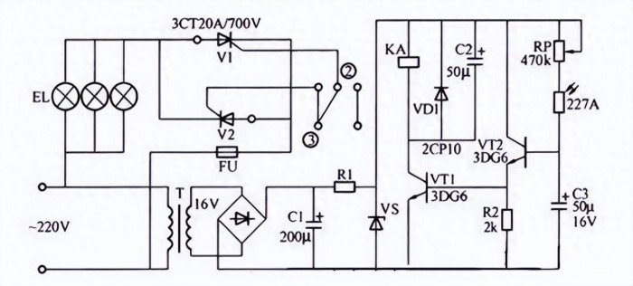 一、當(dāng)白天在較強(qiáng)光照下時(shí),光導(dǎo)管227A(一種光敏電阻)兩端阻值很小,約20~50kΩ,晶體管VT2獲得基極電流而導(dǎo)通,VT1從R2上得到正偏電壓也導(dǎo)通,繼電器線圈KA得電,繼電器的常閉觸點(diǎn)②、③斷開,兩只晶閘管V1和V2沒有觸發(fā)信號(hào)而不導(dǎo)通,燈泡EL不亮。