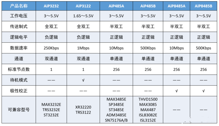 除了RS-232通信芯片外,中微愛芯RS-485系列芯片也在火熱銷售中,現(xiàn)將各參數(shù)對比如下: