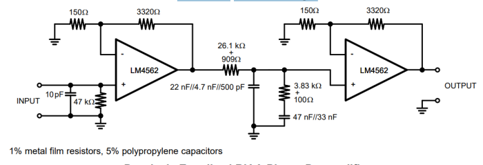 LM4562出色的CMRR(120dB)、PSRR(120dB)和VOS(0.1mV)為放大器提供了出色的運算放大器直流性能。
