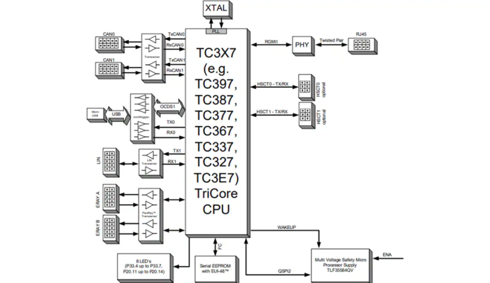 英飛凌AURIX TC3X7評估板(KIT_A2G_TC377_5V_TRB_S)是TriCore TC3X7 AURIX微控制器的演示和開發(fā)平臺。TC3X7 mcu提供了豐富的外設組合,包括1Gbit/s以太網(wǎng),CAN FD, FlexRay 和多個spi。這些設備還符合ISO 26262標準,以支持高達ASIL-D的安全要求,使它們非常適合用于汽車相機系統(tǒng)、高清安全大燈系統(tǒng)和傳感器融合應用。
