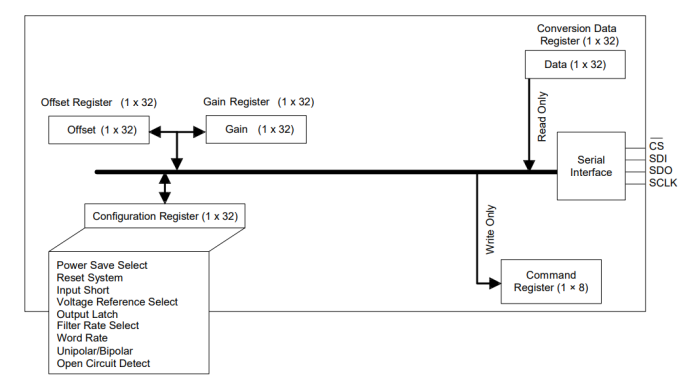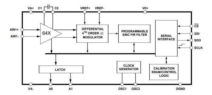 為了適應這些應用,ADC包括一個非常低噪聲、斬波穩定的儀器放大器(12 nV/√Hz@0.1 Hz),增益為64X。該設備還包括一個四階調制器,后面跟著一個數字濾波器,該數字濾波器提供6.25、7.5、12.5、15、25、30、50、60、100120、200、240、400、480、800、960、1600、1920、3200和3840 Sps(MCLK=4.9152 MHz)的二十個可選輸出字速率。