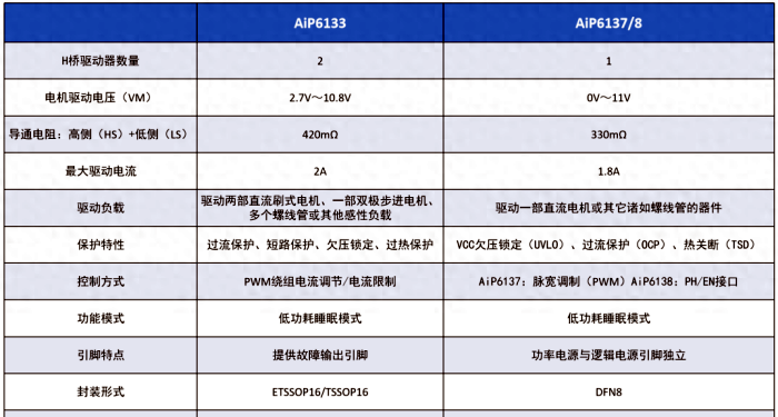 中微愛芯低壓單/雙通道H橋驅動AiP6133/AiP6137/AiP6138的介紹