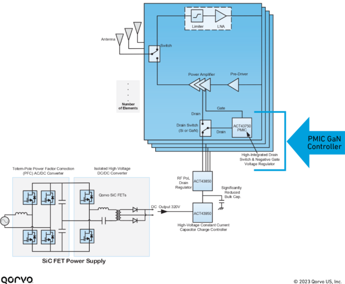 對于RF功率放大器應(yīng)用而言,純凈的發(fā)射器信號并避免電源干擾非常重要,以免在載波頻率周圍產(chǎn)生尖峰(其他線路輻射)。這正是RF PoL的優(yōu)勢所在;它能產(chǎn)生高輸出電壓,有助于優(yōu)化功率放大器的效率,控制功率放大器件的額定值,并構(gòu)建一個可調(diào)的控制回路,從而提供一個低噪聲電源。如下圖所示,借助SiC FETs、 ACT43950和ACT43850這三種電源鏈器件,可以獲得全功能的低噪聲電源鏈。