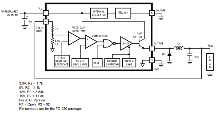 其他特性包括在規(guī)定的輸入電壓和輸出負(fù)載條件下,輸出電壓的規(guī)定公差為±4%,振蕩器頻率的公差為±10%。包括外部停機(jī),具有50μA(典型)備用電流。輸出開(kāi)關(guān)包括逐循環(huán)限流,以及在故障條件下進(jìn)行完全保護(hù)的熱停堆。