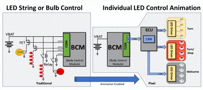 在過去,照明動畫不是一項要求,因此BCM可以使用MCU的通用輸入/輸出(GPIO)引腳輕松啟用FET或繼電器開關(guān)來控制LED燈串或白熾燈泡。今天,BCM的MCU需要控制具有不同LED排列和動畫模式的各種燈。隨著對動畫照明功能需求的不斷增加,BCM現(xiàn)在與照明專用電子控制模塊(ECU)相互作用,向控制單個LED組的多個LED驅(qū)動器發(fā)送命令。