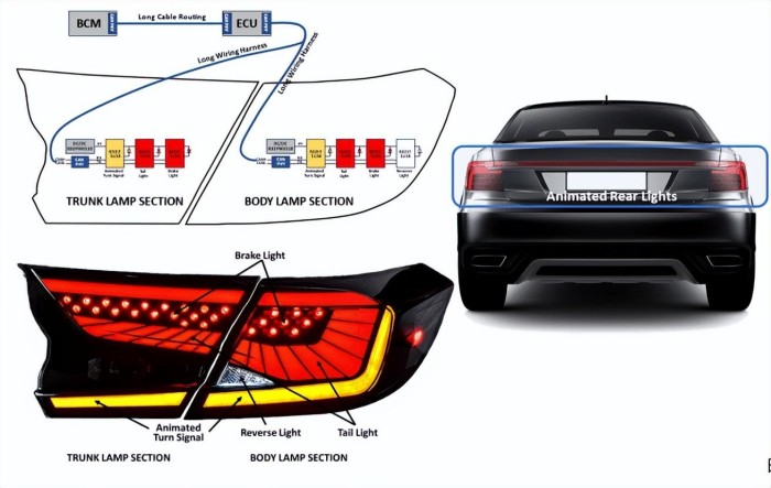 多種多樣的后組合燈(RCL)設(shè)計賦予車輛與眾不同的獨特外觀。從白熾燈泡到LED尾燈的轉(zhuǎn)變開啟了廣泛的設(shè)計可能性,如動畫轉(zhuǎn)向燈、動畫歡迎照明等。實現(xiàn)分裂燈設(shè)計照明效果需要多個LED驅(qū)動器來控制具有不同流明/瓦特和從白色、琥珀色、紅色和超紅色的不同顏色的各種LED。這些照明部件可以分布在車輛上,并使用線束相互連接。