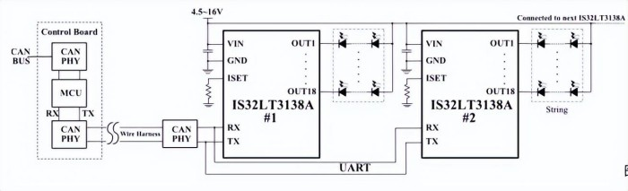 Lumissil的IS32LT3138A LED驅(qū)動器旨在微控制器(MCU)控制板和驅(qū)動器之間建立可靠的板外通信(見圖3)。它提供與CANFD物理層兼容的高速1MHz UART接口。IS32LT3138A通過在線束的發(fā)射端和接收端分別使用工業(yè)標(biāo)準(zhǔn)UART至CAN物理層,實現(xiàn)可靠的長距離通信。每個驅(qū)動器都有18個高壓(16V)恒流通道,便于使用LED燈串。通過使用一個電阻,所有OUTx通道可以配置為吸收高達(dá)100mA的電流。